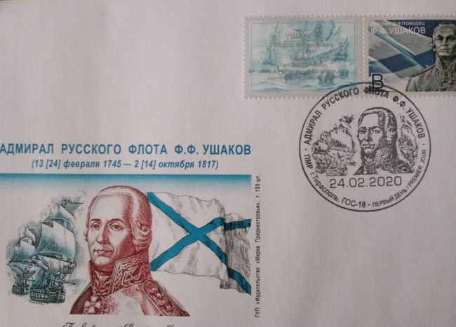Спецгашение также прошло на тираспольском главпочтамте. Выпущен конверт первого дня с портретом флотоводца, изображением Андреевского флага и кильватерного строя кораблей ушаковской эскадры. Почти аналогичная композиция помещена и на штемпеле спецгашения.