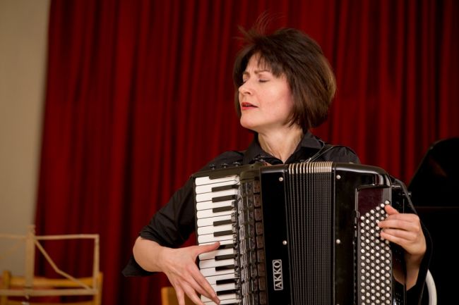 Подойдя к аккордеону, она рассказала историю своего знакомства с этим инструментом. «С детства меня манило и привлекало само слово “аккордеон”. Не знаю, почему, так как вообще серьезно занималась бальными танцами», - отметила она, пояснив, что однажды, заболев воспалением легких, ей пришлось отойти от хореографии. И в это же самое время в школе набирались группы по классу аккордеона, и Власова решила рискнуть.
