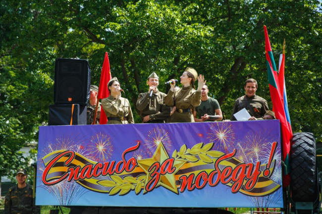 На сайте Минобороны говорится, что 9 мая по населенным пунктам республики будут курсировать передвижные автосцены с местными артистами. Творческие бригады будут выступать буквально под окнами домов, в которых проживают ветераны. Вокалисты исполнят патриотические композиции военных лет.