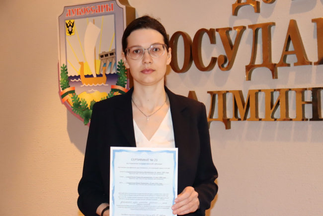 «В Дубоссарах продолжается успешная реализация государственной целевой программы субсидирования молодых специалистов. Сегодня мы вручаем уже 8-й сертификат, а с учетом прошлого года – 23-й сертификат на получение субсидии для приобретения жилья. Субсидия на сумму 193 тысячи рублей. Поздравляю вас с этим важным событием в жизни! Желаю вам приобрести жильё, создать домашний очаг, чтобы вы жили и работали в нашем городе Дубоссары, и чтобы всё у вас было хорошо», - отметил Руслан Чабан.