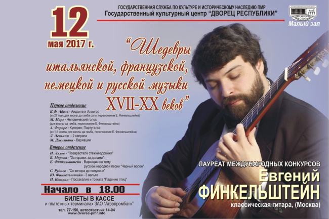Тирасполь, 10 мая. /Новости Приднестровья/. Московский гитарист, лауреат международных конкурсов Евгений Финкельштейн, даст сольный концерт на большой сцене Дворца Республики. 12 мая в 18:00 музыкант исполнит шедевры итальянской, французской, немецкой и русской музыки
