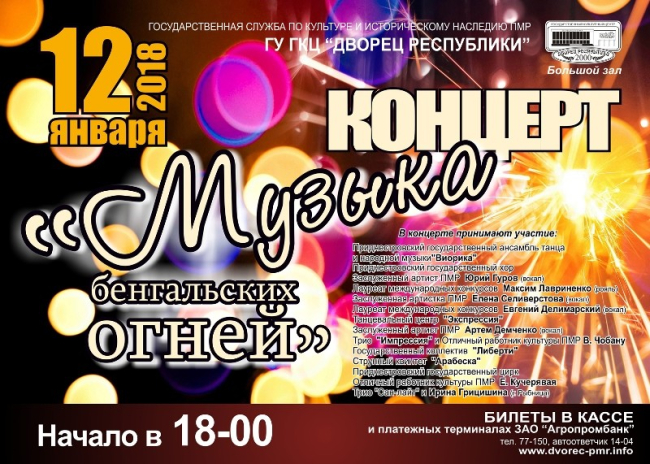 Тирасполь, 9 января. /Новости Приднестровья/. В эту пятницу, 12 января, в большом зале Дворца Республики состоится праздничный концерт популярных приднестровских артистов и творческих коллективов республики.