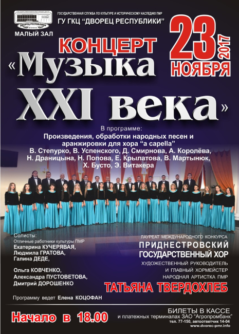 Тирасполь, 20 ноября. /Новости Приднестровья/. 23 ноября в малом зале Дворца Республики состоится сольный концерт приднестровского государственного хора «Музыка XXI века».
