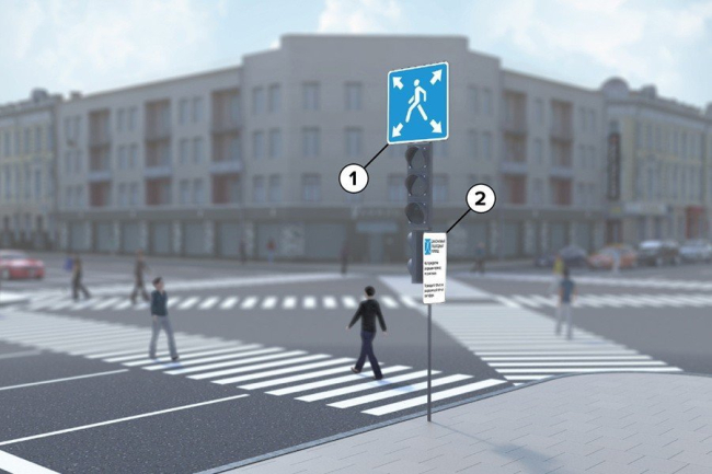Новое обозначение диагонального пешеходного перехода с дополнительными табличками указывает на возможность переходить проезжую часть по диагонали.