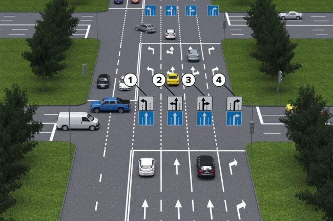 Введенные знаки направления движения на следующем перекрестке помогут водителям перестроиться заранее, а знак перестроения на параллельную проезжую часть проинформирует автомобилистов о приоритетах движения. Есть несколько вариантов обозначений направления движения по полосе с размещением на стрелах дополнительных знаков.