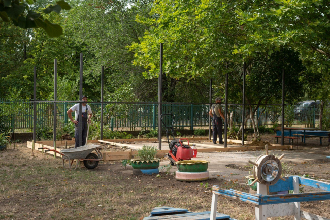 Рабочие меняют кровлю на двух корпусах детского сада. Устанавливают шесть новых теневых навесов в прогулочной зоне. На игровых участках стелют безопасное прорезиненное покрытие. Остальную территорию вокруг дошкольного учреждения мостят тротуарной плиткой. Площадь замощения – 1850 кв.м. В следующем году планируют обновить кровлю ещё на двух блоках.