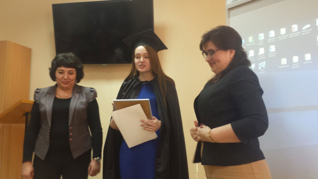 Победителя наградили почетной грамотой и мантией молодого ученого. Научный руководитель Анастасии - Татьяна Борисовна Кулакова - также была отмечена благодарностью.