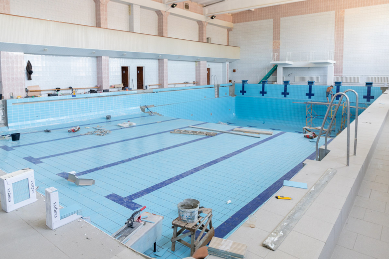 К началу сентября в эксплуатацию планируют сдать городской бассейн. Здесь меняют плитку тоже за счёт местного бюджета.