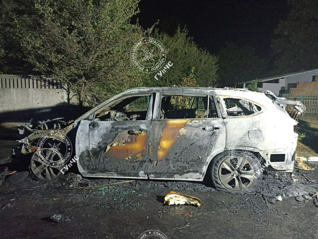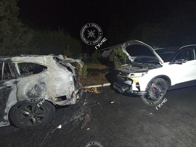 Прибывшие огнеборцы потушили иномарку. Машина выгорела полностью. Огонь также повредил фары, бампер и решётку находящихся рядом автомобилей GEEL и Volkswagen.