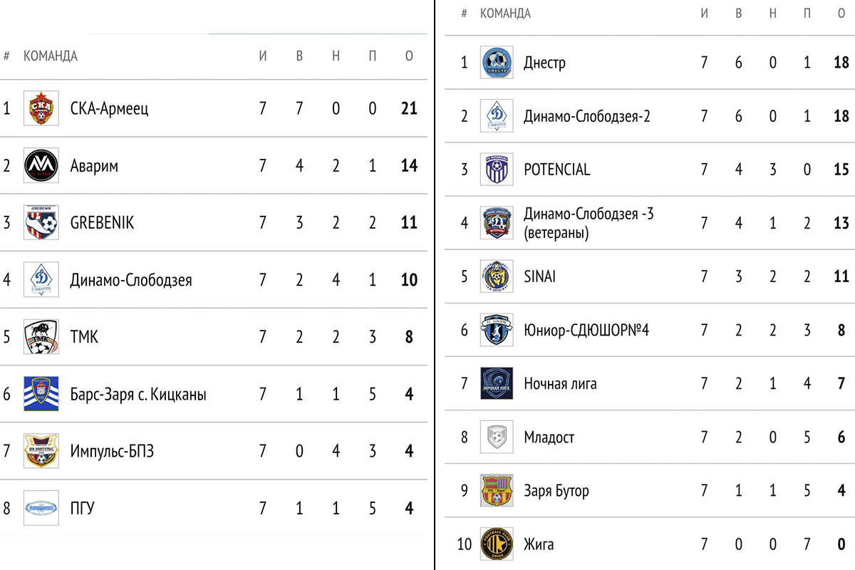 В группе Б борьба за самые высокие места продолжается – впереди ещё два тура. На данный момент по 18 очков у «Днестра» и «Динамо-Слободзея-2». В числе претендентов остаются «Потенциал» (15) и «Динамо-Слободзея-3» (13), а также «Синай», который сохраняет шансы подняться выше. Интрига в этой группе сохраняется до последних матчей.