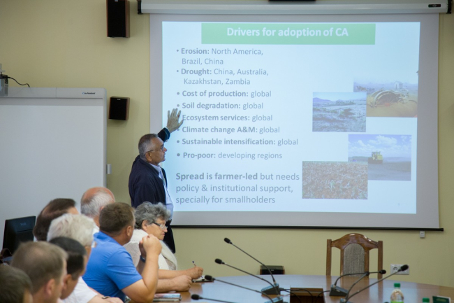 «Мы пригласили научное сообщество, чтобы обновить знания и посмотреть на проблему под новым углом. Большая распаханность привела нас в тупик – наши земли начали заплывать, плодородие стало тяжело удержать без «химии». И западные, и российские учёные постепенно приходят к выводу, что главной движущей силой является наличие в почве гумуса и его воспроизводство. Идеи нашли отклик у землепользователей, мы начинаем работу по переходу на классическую технологию, которая связана не только с нулевой обработкой, а прежде всего с включением в севооборот таких бобовых культур, как горох, люцерна, вика и т.д.», – отметил в интервью начальник управления науки и информации Министерства сельского хозяйства и природных ресурсов ПМР Федот Цыбульский.