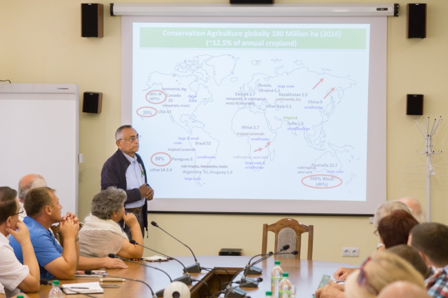 Тирасполь, 4 июля. /Новости Приднестровья/. В Приднестровском госуниверситете прошла встреча с английскими гостями – представителями ассоциации консервативного (органического) земледелия Великобритании, профессором Амиром Кассамом и фермером Тони Рэйнолдом. Встреча стала продолжением вчерашнего разговора, только его участниками были не фермеры и сотрудники Минсельхозприроды, а представители научного сообщества республики. Это сотрудники ПНИИ с/х, профильных кафедр ПГУ, НИИ экологии и природных ресурсов. Тема та же – консервативное земледелие. Разговор о нём в Приднестровье ведут уже давно, ему посвящали ряд практикумов и семинаров. Причина проста – обеднение почвы, её эрозия, снижение урожайности (при возрастающих вложениях в обработку земли), засухи и другие факторы вынуждают фермеров думать о том, как вернуть земле былое плодородие.