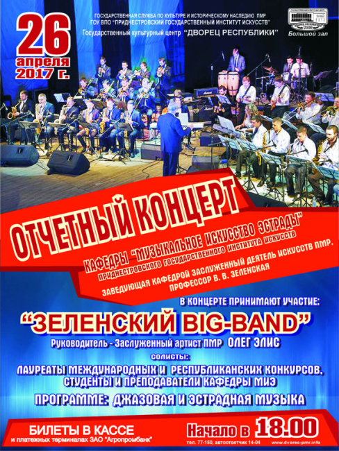 Тирасполь, 25 апреля. /Новости Приднестровья/. 26 апреля в 18:00 в большом зале Дворца Республики пройдёт отчетный концерт кафедры «Музыкальное искусство эстрады» Приднестровского государственного института искусств (ПГИИ).