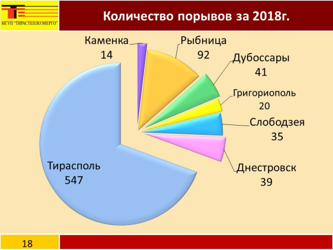 «После определения среднегодового количества порывов, приходящихся на 1 км тепловых сетей, было выявлено, что в прошлом году тепловые сети всех городов и районов относятся к категории "приемлемые рабочие ресурсы". Напомню, что в 2017 году сети Григориополя относились к предкритическому уровню аварийности, а Тирасполя – к нему приближались. Благодаря проведенному в 2018 году комплексу ремонтных работ количество порывов на тепловых сетях в данных регионах сократилось», – отметил гендиректор МГУП «Тирастеплоэнерго» Олег Ищенко.
