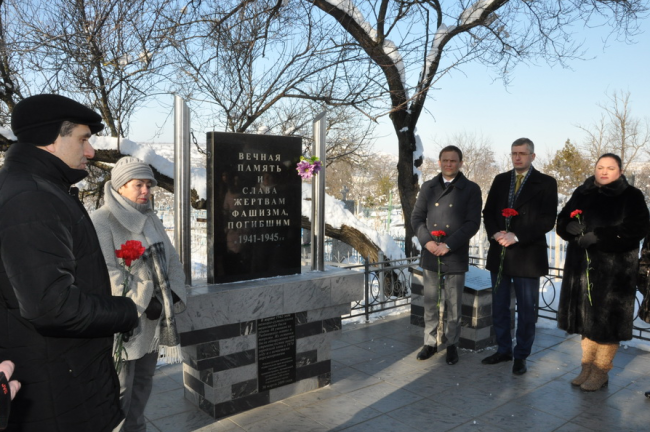 Память жертв Холокоста также почтили у памятника погибшим в годы ВОВ. Здесь в 1974 году были перезахоронены останки 48 евреев – узников гетто и тюрьмы, которые были заживо похоронены нацистами в марте 1942 года.