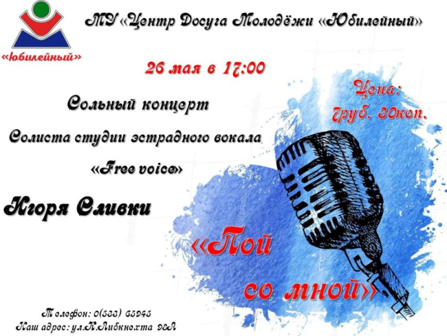 Билеты на концерт «Пой со мной» можно приобрести в кассе МУ «Центр досуга молодёжи «Юбилейный». Начало — в 17:00