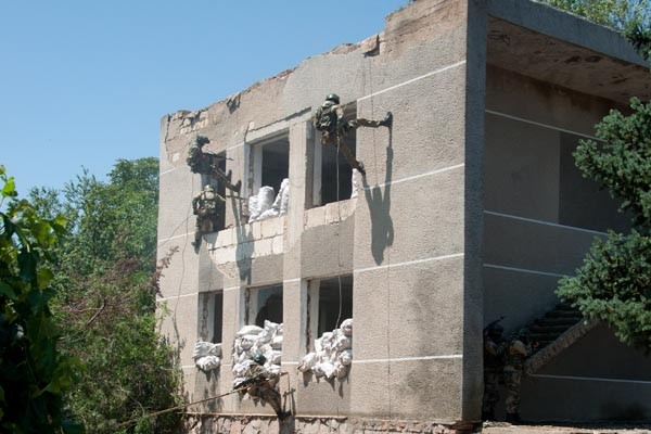 На заключительном этапе занятия одна из штурмовых групп армейского спецназа, усиленная бронетранспортером, продемонстрировала офицерам свое умение быстро проникать в захваченный объект и, используя специальную тактику боя, наносить неприятелю огневое поражение.