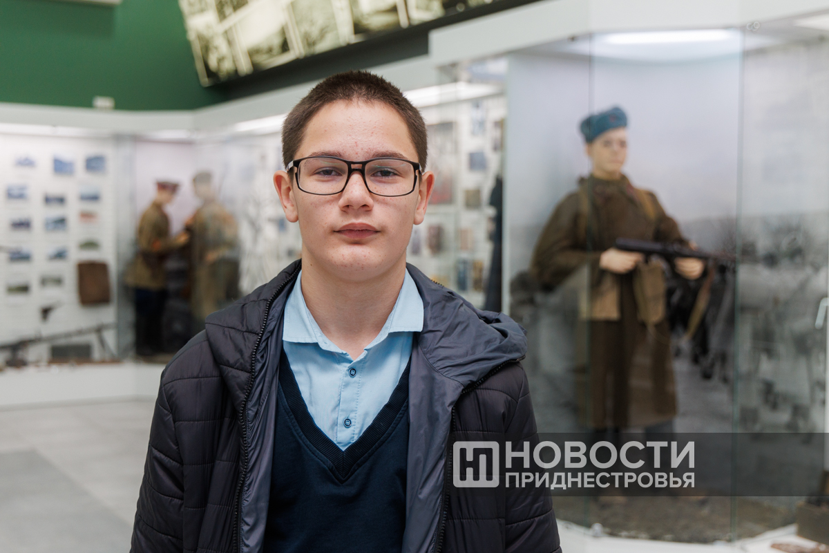 В зал «Приднестровье в годы Великой Отечественной войны 1941-1945 г..» вошёл Никита Хуторянский из Ближнехуторской школы. Он уже посмотрел военную технику, теперь принимался за другие предметы этого периода.