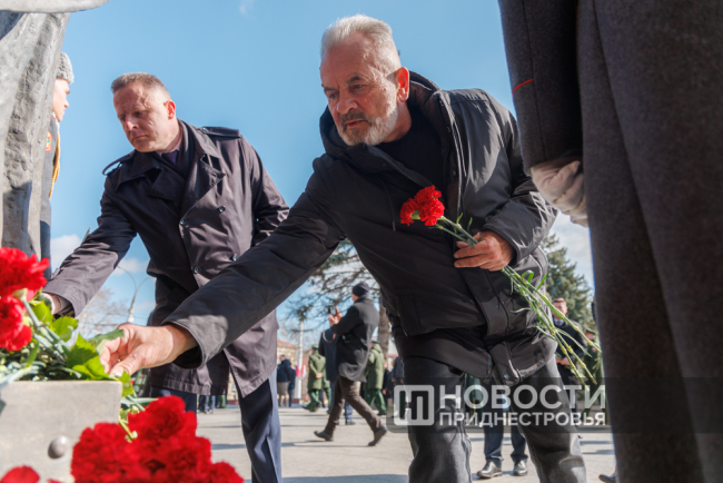 Вадим Красносельский первым воздал дань памяти, возложив венок к Вечному огню, после чего поднялся к гранитным плитам с именами павших героев.