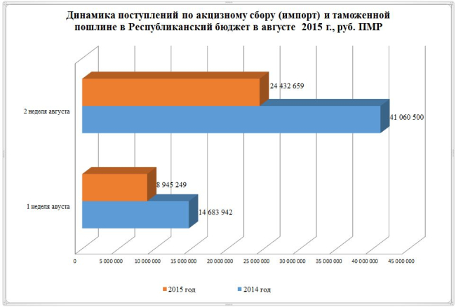 Данные поступления с акцизного сбора (импорт) и таможенной пошлины существенно понижают средние показатели. В сравнении с аналогичным отчетным периодом за прошлый год они уменьшились практически в 2 раза и составили 24 432 659 рублей.