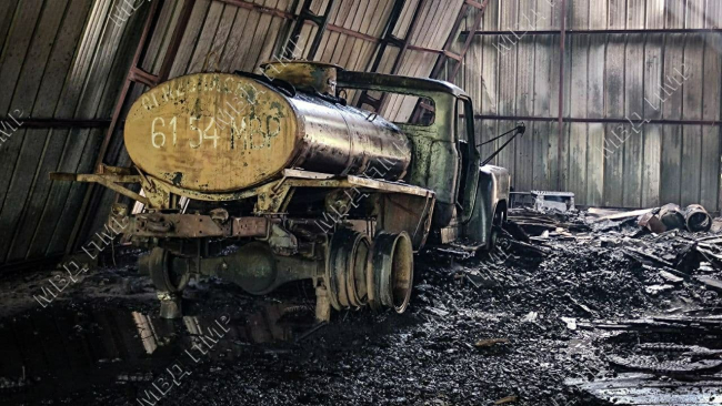 Помещение выгорело полностью, ангар местами повреждён пламенем.