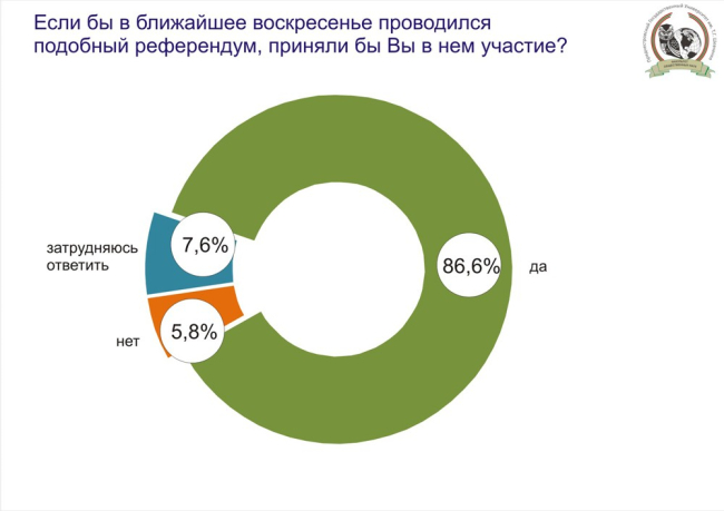 Тирасполь, 20 сентября. /ИА «Новости Приднестровья"/. 17 сентября жители республики отметили 10-летие референдума в ПМР. Тогда 97% приднестровцев высказались за независимость ПМР и её последующее свободное присоединение к России. Если бы такой плебисцит состоялся сегодня, то 86,6% приднестровцев приняли бы в нем участие. 7,6% затруднились с ответом, еще 5,8% не стали бы принимать участие в голосовании.