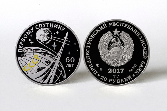 Первая - «60 лет запуска первого искусственного спутника Земли» - выполнена из драгоценного металла (серебра) номиналом 20 рублей ПМР. Данная монета продолжила серию «Освоение космоса». Её тираж - 300 штук.
