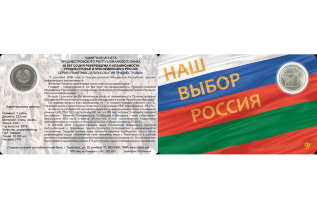 ПРБ выпустил буклет с памятной монетой «10 лет со дня референдума о независимости Приднестровья и присоединения к России»