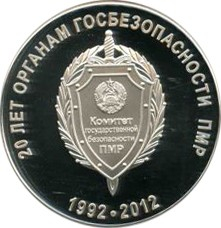 На лицевой стороне монеты в центре изображён герб Комитета государственной безопасности ПМР, по кругу слева направо — надпись «20 лет органам госбезопасности ПМР»; внизу — надпись «1992−2012».