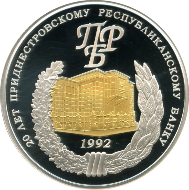 На лицевой стороне монеты в центре изображено здание Приднестровского республиканского банка, выполненное в позолоте, над ним — аббревиатура «ПРБ», по кругу — надпись «20 лет Приднестровскому республиканскому банку»; внизу — год основания банка «1992» и обрамление в виде венка из лавровых и дубовых веток.