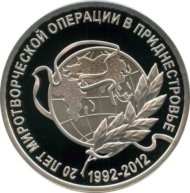 На лицевой стороне монеты в центре изображён голубь мира в виде ленты, опоясывающей земной шар и лавровая ветвь, по кругу слева направо — надпись «20 лет миротворческой операции в Приднестровье», снизу — надпись «1992−2012».