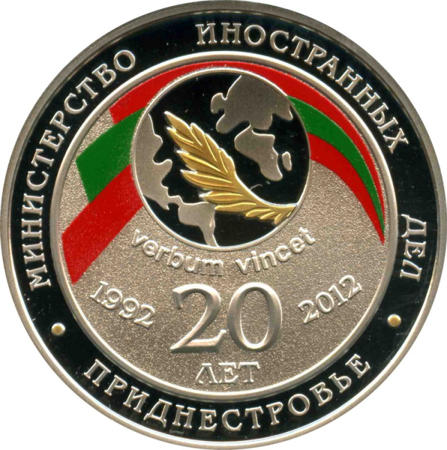 С 20 декабря 2012 года Приднестровский республиканский банк также вводит в обращение памятную серебряную монету достоинством 20 рублей «20-я годовщина образования Министерства иностранных дел ПМР» серии «Государственность Приднестровья». Она также изготовлена из серебра 925-й пробы, её диаметр — 32 мм, тираж составляет 250 штук.