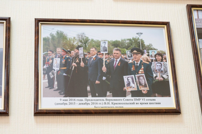 Сегодня коллектив приднестровского парламента поздравил Президент ПМР Вадим Красносельский. Глава государства ознакомился с экспозицией, подготовленной к праздничной дате. Фотоматериалы – своего рода иллюстрации к летописи приднестровского парламентаризма – от Временного Верховного Совета до сегодняшнего дня. На архивных фотографиях события и люди, сыгравшие важную роль в создании и становлении страны и ее ровесника – органа законодательной власти. Экспозиция собрана из 123 снимков. Содействие в создании выставки оказали пионеры приднестровского парламентаризма – Анна Волкова и Вячеслав Загрядский. Использованы работы фотографов Валерия Кругликова и Лемара Корзилова, а также кадры, собранные в разные периоды и сохраненные сотрудниками пресс-службы Верховного Совета.