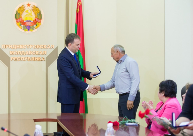 За многолетний добросовестный труд в деле обучения и воспитания подрастающего поколения, высокий профессионализм и в связи с Днем учителя Президент Евгений Шевчук наиболее отличившимся педагогам лично вручил государственные награды, а также присвоил почетное звание «Заслуженный работник народного образования ПМР», сообщает пресс-служба Главы государства.