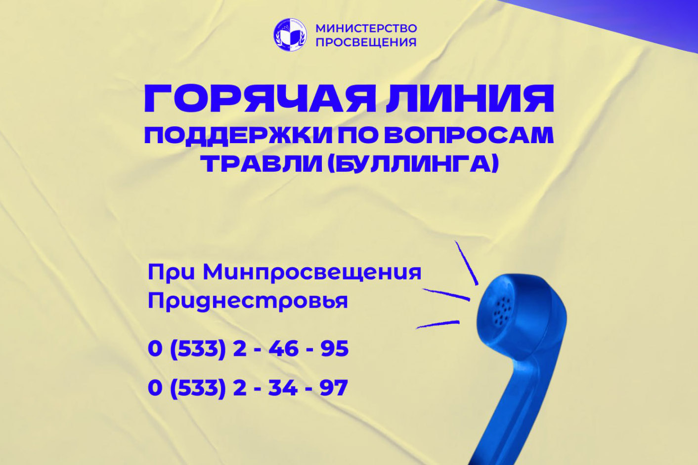 29 Янв.., 2026, 14:56Тирасполь, 29 января. /Новости Приднестровья/. При Министерстве просвещения ПМР работает горячая линия по вопросам травли (буллинга) в образовательных учреждениях. Её номера: 0 (533) 2-46-95, 0 (533) 234-97.