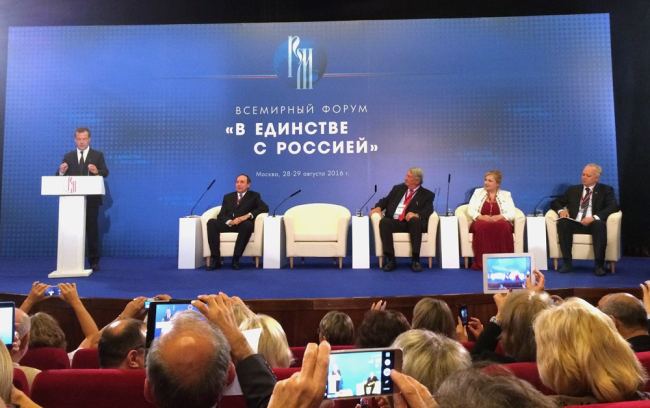 В числе участников форума был председатель правительства РФ и лидер «Единой России» Дмитрий Медведев. В своём выступлении он говорил о важности включения проживающих за рубежом россиян в процесс принятия важных решений, касающихся русского зарубежья. По мнению Дмитрия Медведева, очень важно, чтобы соотечественники за рубежом не теряли связи с Россией, оставались в культурном и информационном поле страны.
