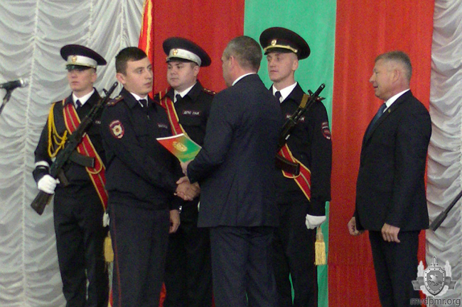 Поздравить стражей порядка Рыбницкого ОВД прибыл первый заместитель министра внутренних дел Сергей Левинский. У памятника сотрудникам ОВД, погибшим при исполнении служебного долга, приняли присягу 12 молодых сотрудников органов внутренних дел.