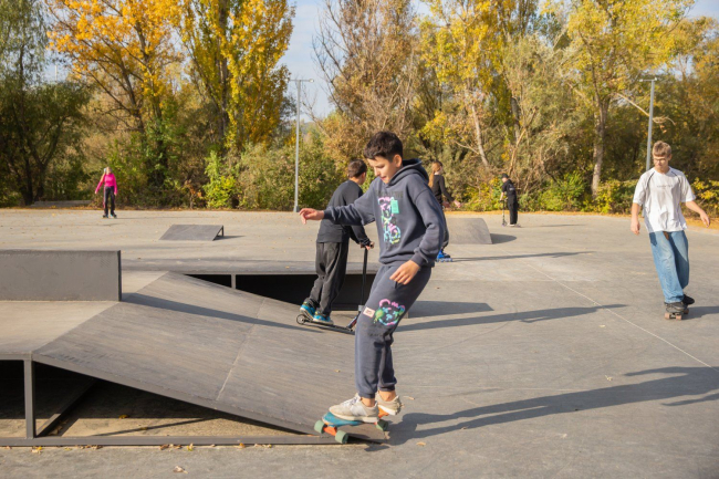 Забетонирована площадка под спортивно-развлекательный сегмент. Часть горок уже установили, еще три изготавливают. Вадим Красносельский обратил внимание на материал. Горки металлические, в отличие от тех, что установлены на роллердромах других городов. Президент, отметив долговечность такого оборудования, сказал, что будет рекомендовать всем главам со временем заменить существующие искусственные возвышенности, выполненные из фанеры, на металлические. Кроме того, глава государства рекомендовал установить ограждение спортивной зоны.