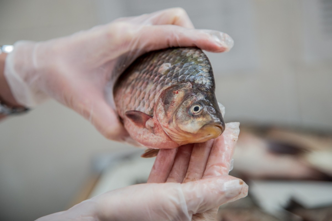 После этого сотрудник-лаборант берет из каждой партии от 3 до 5 образцов для органолептического исследования или визуального контроля. Осматривает цвет, чешую, жабры, глаза, также производит бактериоскопию (анализ на среднее количество микроорганизмов), пероксидаз (свежесть рыбы) и другие мероприятия.