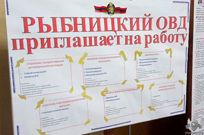 Рыбничанам предложили службу в органах внутренних дел. В территориальный ОВД требуются: участковые; инспекторы ДПС; сотрудники дежурной части, линейных отделов милиции, инспекции по делам несовершеннолетних и изолятора временного содержания.