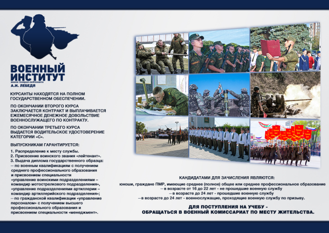 Стать курсантом Военного института могут юноши, которые являются гражданами ПМР, имеют среднее (полное) общее или среднее профессионнальное образование. По вопросам поступления в военный вуз можно обращаться в военные комиссариаты по месту жительства. Дополнительную информацию можно получить на сайте Военного института или по телефону 0 (533) 5-36-86.
