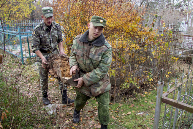 Тирасполь, 23 октября. /Новости Приднестровья/. Военнослужащие провели уборку мест захоронения советских воинов на одном из столичных кладбищ. Накануне в адрес министра обороны поступило письмо от ветерана Вооруженных сил Анатолия Белова с просьбой оказания помощи в приведении в надлежащий вид так называемой «офицерской линейки» (массового захоронения советских военнослужащих) на одном из уже закрытых столичных кладбищ.