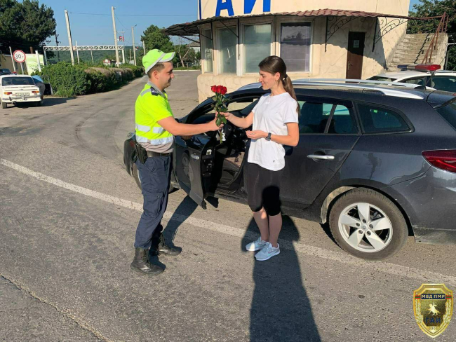 Как сообщила пресс-служба МВД ПМР, сотрудники ГАИ дарили розы всем девушкам и женщинам, которых встречали на пути утром 7 июня.