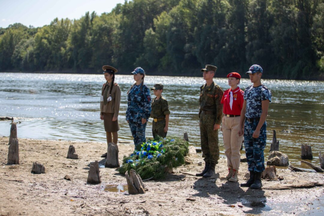 Сегодня участники тематического мероприятия спустили на воду венок. У монумента были организованы фотозоны и выставка исторического оружия, которую подготовили представители общественной организации «Наследники Побед».