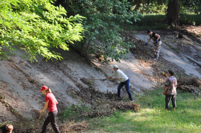 200 работников бюджетных организаций города были задействованы в центральном парке. Они скосили сорняки и срезали поросль на одном из отдаленных участков, а также очистили от сухой травы и мусора бывшие витгенштейновские озёра.