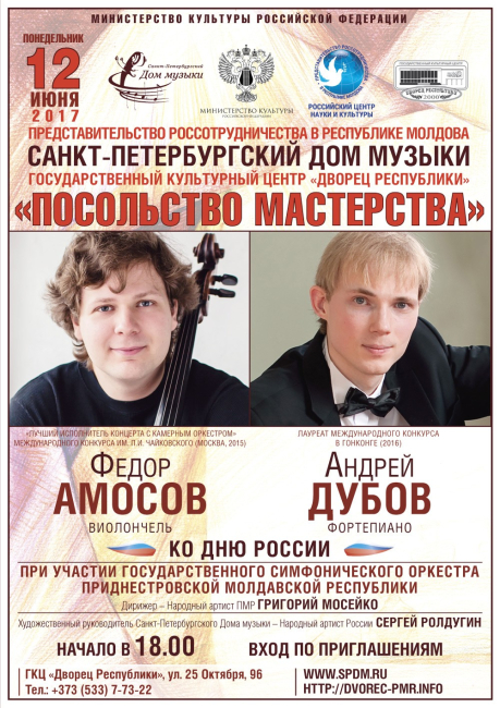 Напомним, что проект Санкт-Петербургского Дома музыки «Посольство мастерства» занимается подготовкой молодых российских музыкантов к международным конкурсам и фестивалям. В прошлый раз, в мае, в Приднестровье выступили лауреаты XV Международного конкурса им. П.И. Чайковского.