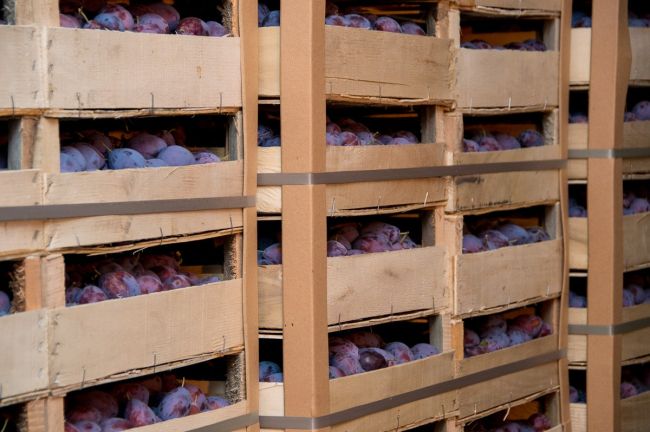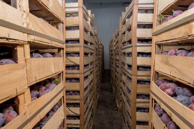 Непосредственно из сада продукция поступает в камеры предварительного охлаждения, и уже потом – в камеры на длительное хранение. В каждую камеру можно поместить до 200 тонн сливы, и здесь она может находиться до нескольких месяцев.