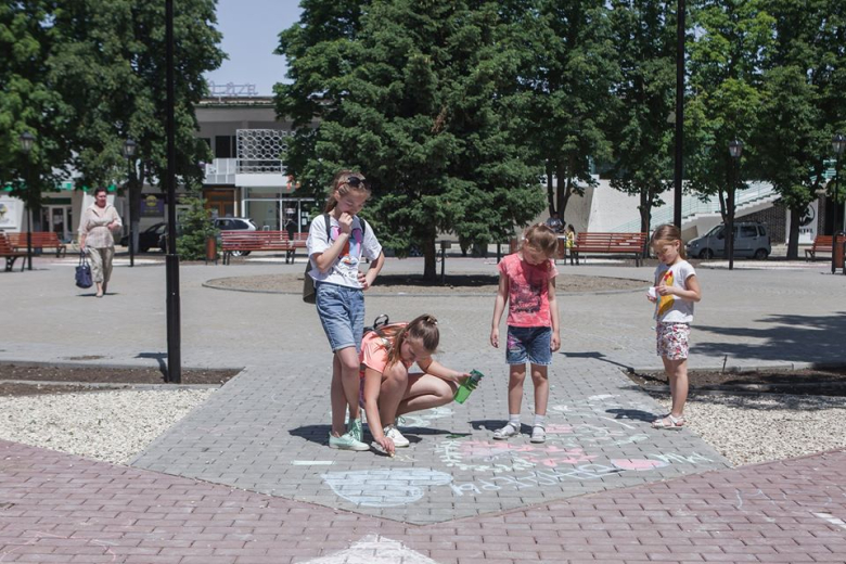 На субботник пришли целыми семьями. Каждый украшал сквер по-своему: взрослые сажали траву, дети рисовали мелками на асфальте и тротуарной плитке. Потом все ребята получили мороженое за вклад в общее дело.