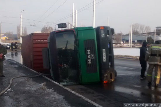 Бендеры, 3 февраля. /ИА «Новости Приднестровья»/. В Бендерах перевернулся 35-тонный грузовик MAN. Гружённая пшеницей машина ехала транзитом через Приднестровье из Молдовы в Украину. По предварительному заключению госавтоинспекторов, причина аварии – нарушение Правил дорожного движения.