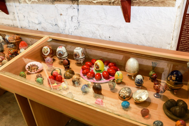 Пасхальных и сувенирных яиц здесь больше всего – порядка 300, керамические, каменные, стеклянные, с образами святых и расписанные гжелью, они – как разноцветная палитра различных временных эпох и исторических периодов.